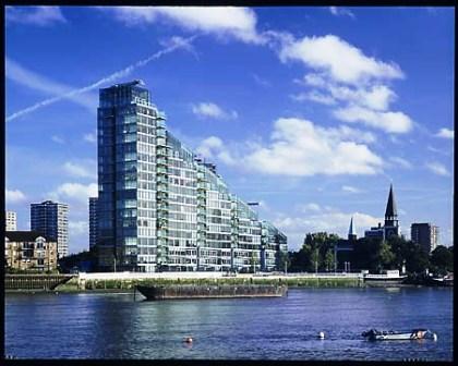 block of flats glass steel stepped riverside exterior lifts exterior lift shafts